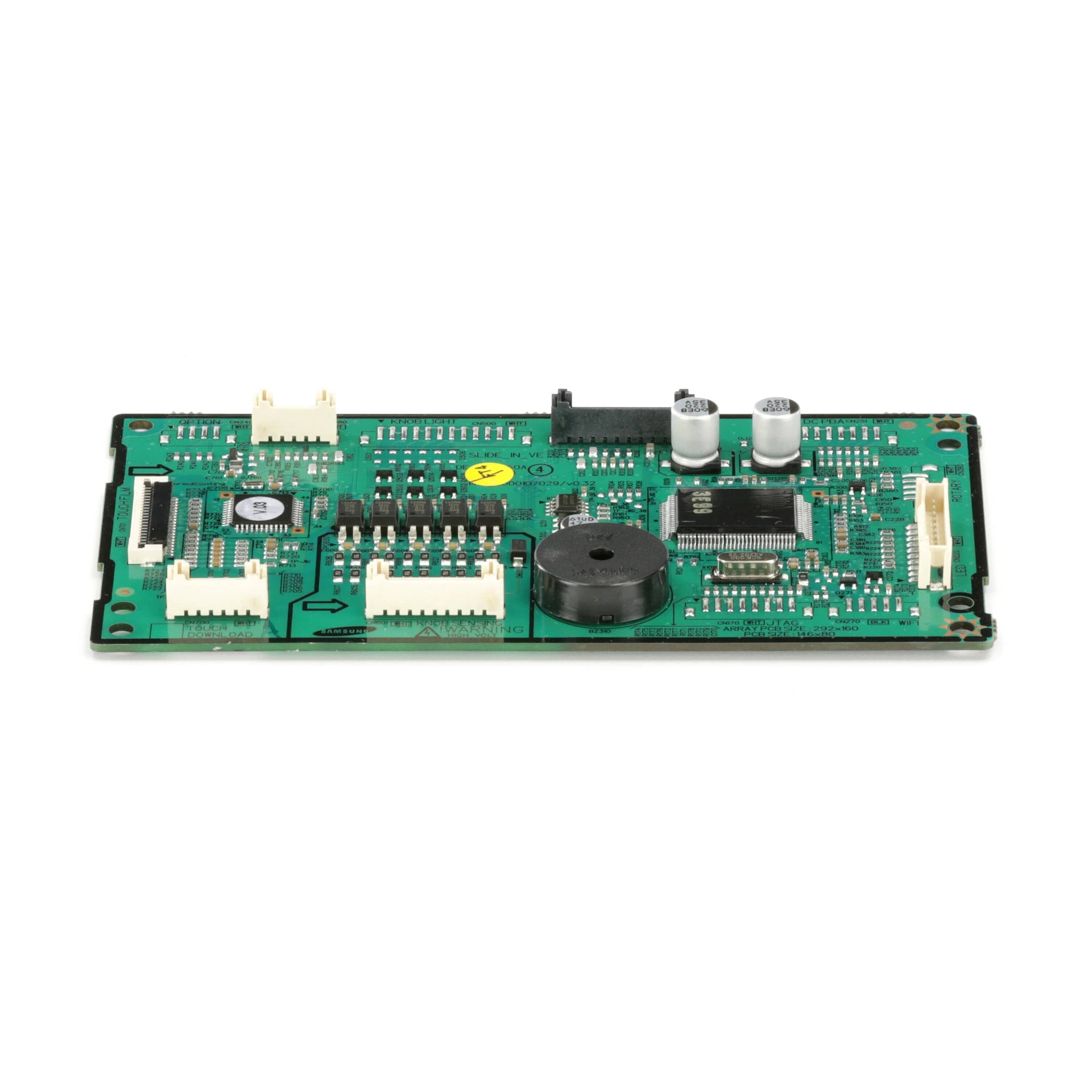 Cette carte de commande de four (référence DE94-03610A) est destinée aux cuisinières. Elle surveille la température et régule la puissance du four. Débranchez la cuisinière ou coupez le disjoncteur de la maison avant toute intervention. Portez des gants de travail pour vous protéger les mains.